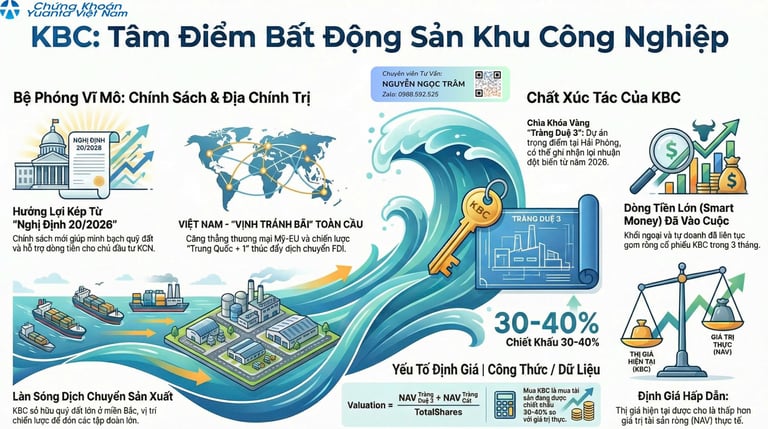KBC là một trong những doanh nghiệp bất động sản khu công nghiệp lớn nhất Việt Nam, với tổng quỹ đất thương phẩm còn lại lên tới gần 3,000 ha đất KCN và 1,747 ha đất KĐT. Điều đáng chú ý là nhiều dự án trọng điểm như Tràng Duệ 3 (456ha), Cụm KCN Hưng Yên, và đặc biệt KĐT Tràng Cát (585ha) đều đã hoàn tất các thủ tục pháp lý hoặc gần như sẵn sàng triển khai. Vị trí chiến lược tại Bắc Ninh, Hải Phòng, Hưng Yên giúp KBC đón đầu xu hướng dịch chuyển sản xuất và FDI trong dài hạn. Với sự chuẩn bị kỹ lưỡng về quỹ đất và pháp lý, KBC đang ở tư thế sẵn sàng cho giai đoạn bứt phá 2026–2030.